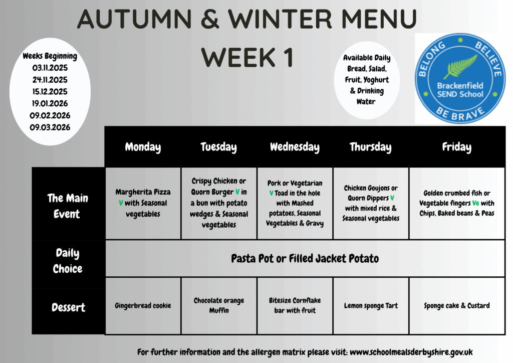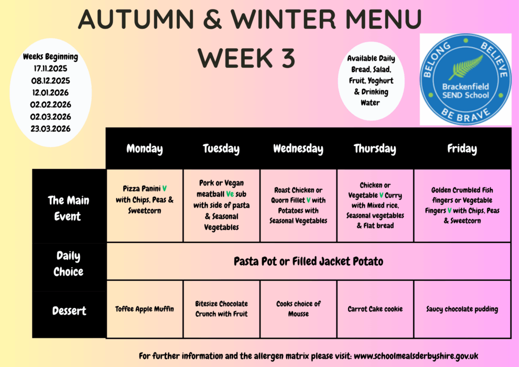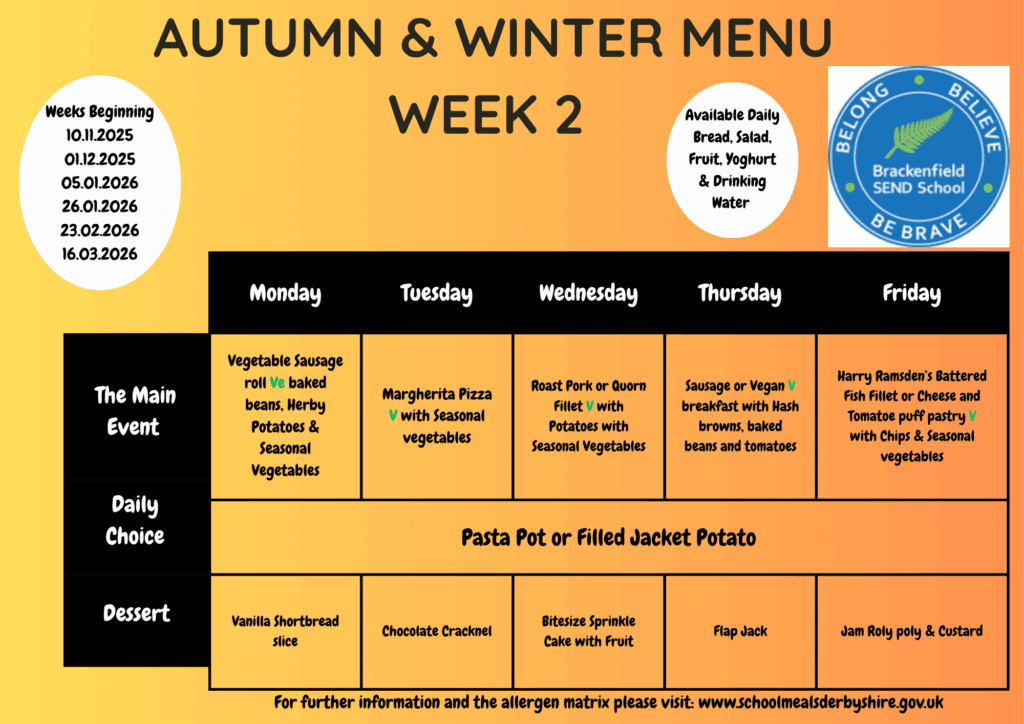 Please be aware that Brackenfield SEND School does not cook food on site and sources all meals from Derbyshire Catering Services.